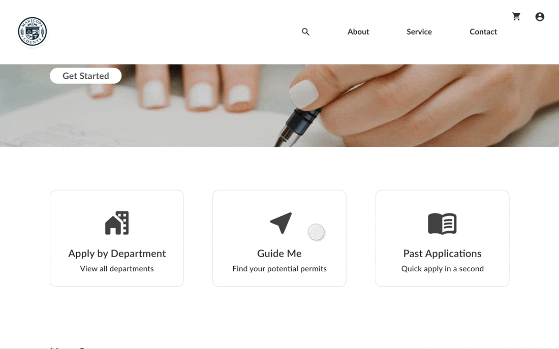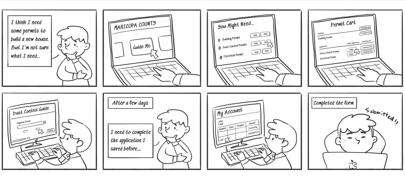 The project was a collaboration with Maricopa County Innovation Studio Department to focus on the permitting services website of three departments, which are Planning and Development, Environmental Services, and Air Quality. The goal of Maricopa County was for users to successfully complete online permit applications in the first attempt.